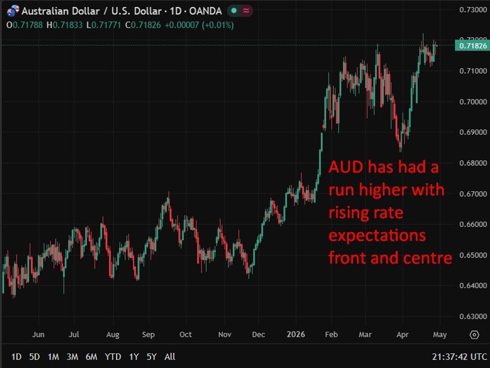 - CBA calls for a 25bp RBA rate rise in May to 4.35%, though flags the decision as line ball between inflation and growth risks
