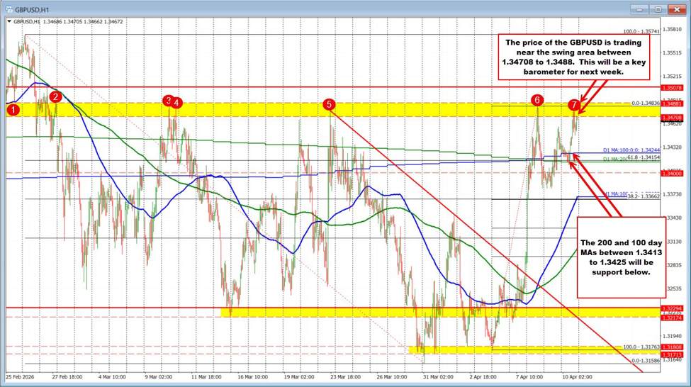 Bottom line: The battle lines are clearly drawn. Resistance above at 1.34708–1.3488 defines the upside breakout zone, while support below at the 100- and 200-day moving averages defines the risk for buyers. With price squeezed between these levels, the pair is coiling into the close, and the next directional move will likely be driven by weekend headlines and how traders respond in the early hours of Monday trading.