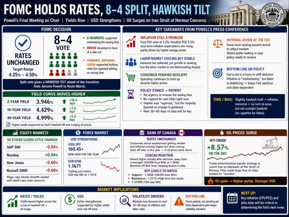 The vote came in at 8–4, with Miran dissenting in favor of a rate cut, while Hammack, Kashkari, and Logan supported holding rates but opposed adding an easing bias to the statement. That group effectively pushed back against signaling near-term rate cuts—giving the decision a hawkish tilt, especially heading into the leadership transition from Jerome Powell to Kevin Warsh.