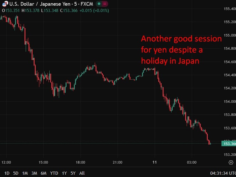 It was a Japanese market holiday today, with cash equities and bond trading closed. The yen nevertheless strengthened in regional trade, with USD/JPY dipping below 153.40 in Asian centres. There was no obvious fresh catalyst. Market commentary cited fading concerns about a fiscal crunch in Japan and ongoing divergence between Bank of Japan tightening and Federal Reserve easing.