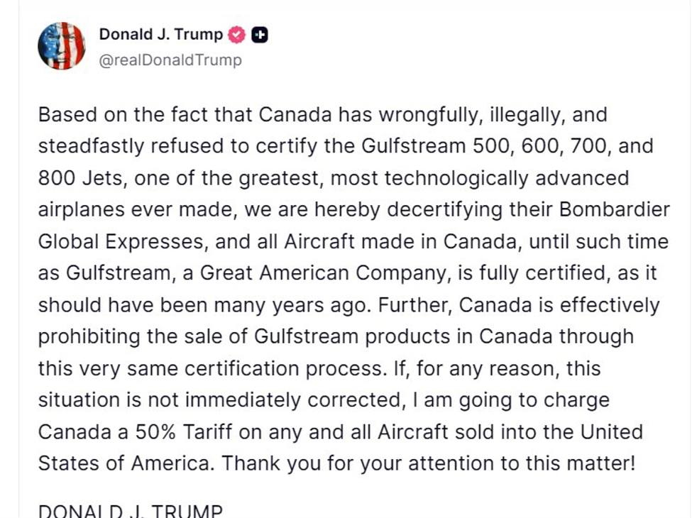 In response, Trump said the US would move to decertify Canadian-made aircraft, including Bombardier Global Express jets, until Gulfstream models are fully certified in Canada. He also warned that if the situation is not “immediately corrected,” the US would impose a 50% tariff on all aircraft sold into the United States from Canada.