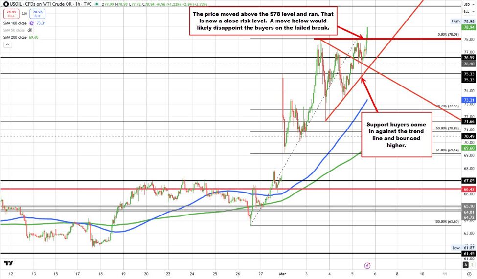 Looking at the hourly chart, the price earlier in the session moved up to test Tuesday’s high near $78. The market briefly pushed to a new high around $78.09, but the rally stalled and prices rotated lower.