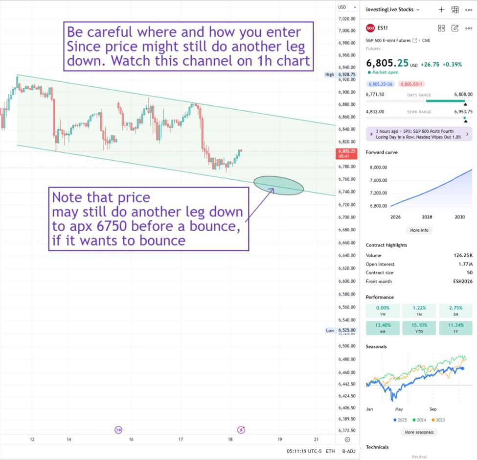 The below 1-hour chart of the S&P 500 E-mini Futures (ES1!) highlights a distinct descending channel, suggesting that traders should be patient with their entries as the short-term trend remains bearish. Although the price is currently hovering around 6,805, the analysis warns of a potential continuation downward to test the channel’s lower support boundary. Specifically, the chart points to a target area near 6,750 (highlighted by the green oval) where the price might find a floor; but we do not know if it will get there. Still, this channel on the 1hr timeframe can also be a guide going forward.