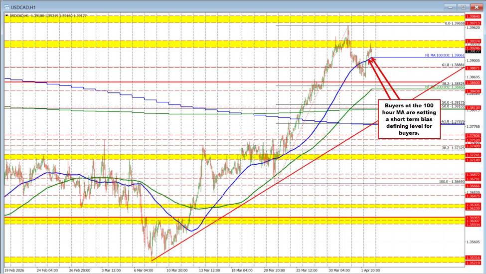 However, today’s price action has shifted the tone back to the upside. Supported by stronger USD demand and rising oil prices, the pair rebounded and moved back above the 100-hour moving average (currently near 1.3906). Importantly, there have now been two successful retests of that level—first during the early European session and again in early North American trading—with buyers stepping in each time. That keeps the buyers in control in the short term.