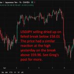 On the downside, sellers also failed to gain lasting control. The price briefly broke below that support zone to a low of 157.90, but like the failed upside breakout the day before, momentum stalled quickly. Buyers stepped back in, and the pair rotated higher once again.