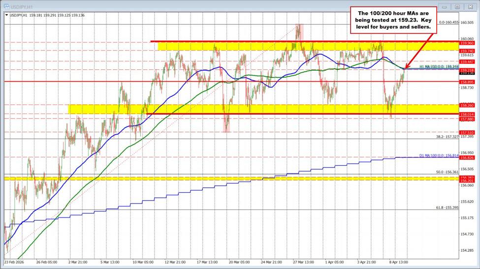 That upside momentum has carried into today’s session, with price extending toward the converged 100- and 200-hour moving averages near 159.23. The high reached 159.28—just above that cluster—before rotating back down toward 159.17.